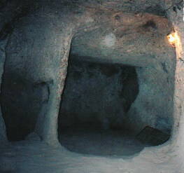 | 地底都市といって思いつくのは、 カッパドキア奇譚のユーリが逃げ回ったシーン。 写真じゃわからないかもしれないけど、 結構暗いし、それに天井も低くって こんなところで駆けずり回るなんて とてもとても! 運動神経生きていく上での 最小限の私にはとてもじゃないけど できません!(笑) |