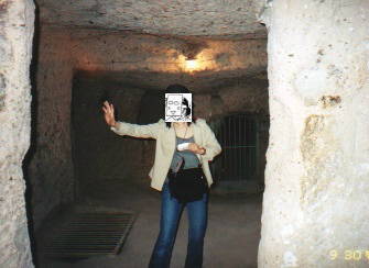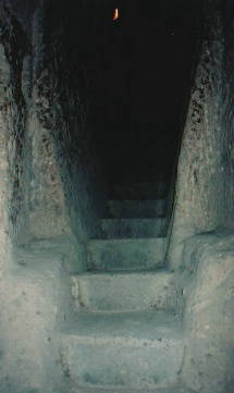 | 階段です。これ見ても暗いでしょ。本当に暗かったのよ。 ねね、結構デカイから、背中をだんご虫のように丸めて 歩いたの覚えています。現地ガイドさんが 「止まらずに歩いてください、写真なんか取らないで! 後ろの人が閉じ込められます!」 と叫んでいました。 でも撮った(笑)。 |