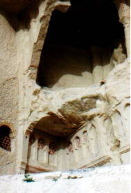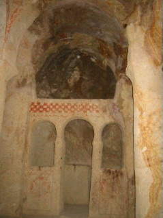 | 同じく洞窟の教会です。 バジル教会、リンゴの教会、バルバラ教会、へびの教会などを はじめ30ほどの教会があるようです。そのうちのいくつかに 入りましたが、壁や天井に書かれたフレスコ画は色もきれいで 結構鮮やかでした。 |