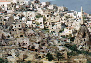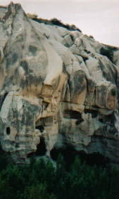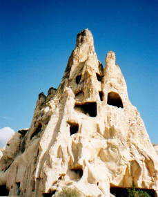 | こちらも上に同じ。左は上の写真と色が違うけど、 それは現像の問題で多分同じ場所なんだと思う。 たぶんね(笑)。 岩は触れるだけでパラパラと落ちる凝灰岩だそうです。 あ、別に触れたわけじゃないですよ。もちろん見学だけです。 ガイドブックにそう描いてあったんです! ユーリのように岩の間をアスランでかけてみたかったけどね(笑)。 ちなみに写真では見えないけど、岩のところどころに 開いている穴は迫害を受けたキリスト教徒たちの隠れ家 の跡なんだそうです。 |