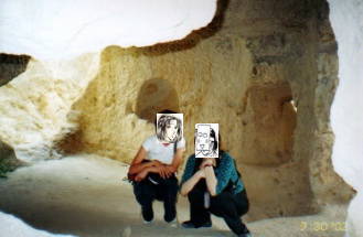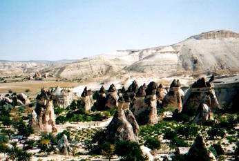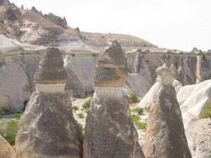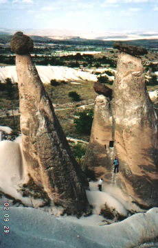 | カッパドキアらしい風景だなーと、右のキノコの岩を見たとき 思いました。岩と岩の間に生えている植物はブドウなんだ そうです。ここではビデオカメラに向かって、とレポーターに なったつもりで世界不思議発見ごっこやりました。 「さて、問題です。岩と岩の間に生えている植物は 何でしょう?」(笑)。 |