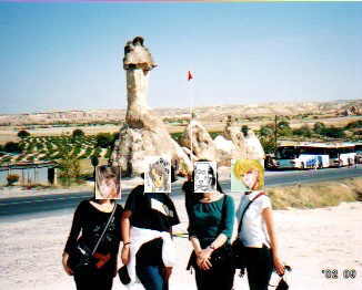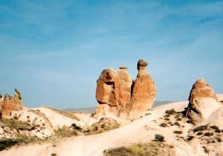 | らくだの岩です。↑の場所からはバスでちょっと 移動したところにありました。色といい、コブの形と いい、まさにらくださんですよね! ここでは、「ねね専属絵描き女さーん、カッパドキア ですよー、らくだの岩ですよー。絵描いて〜!」 と叫びながらビデオ撮った記憶が……(笑)。 |