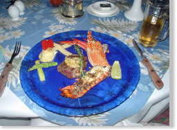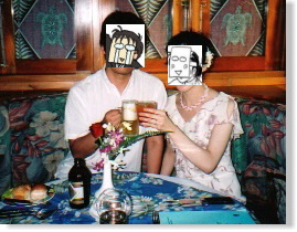 | 夕食はウェディングディナー。 飲み物は、ねねはビール。婿殿はカシスオレンジを 注文。乾杯の写真を撮ってくれるというので 乾杯のふりをしたのだが…… 「ちょっとまって! 私がカシスオレンジのほうが かわいいわよね! ビールと交換!」 ビールとカシスオレンジを交換して写真を撮る。 ねね満足の絵になる?一枚。 計算高い女である。 |