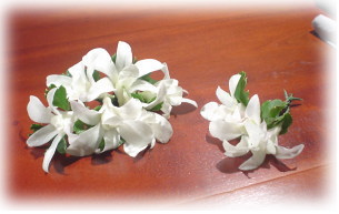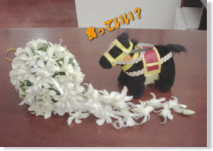 | 頭につけていた花〜。 ブーケを含め持って帰りたいが、ナマモノなので 持って帰れない〜。 |